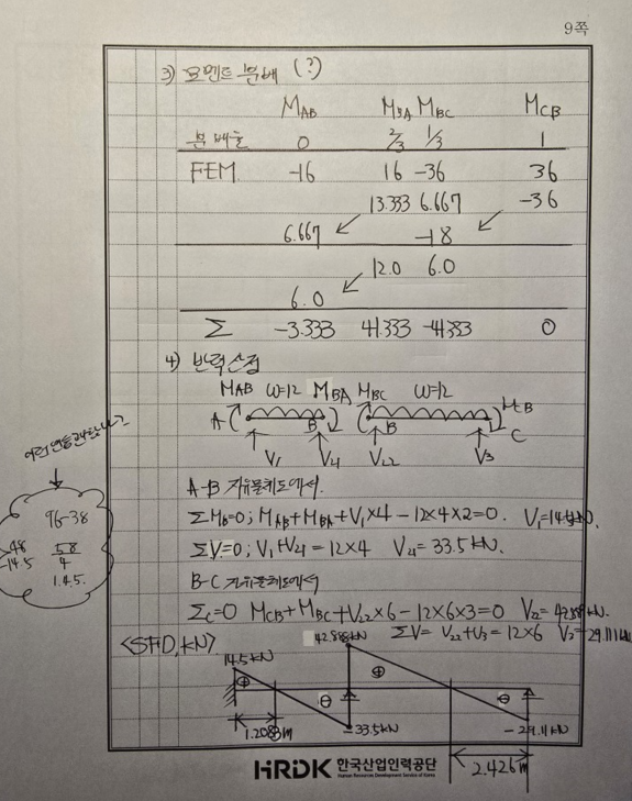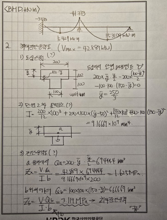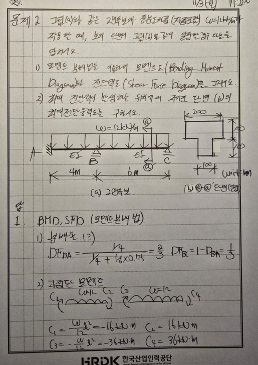 [구조] 2연속보에 등분포하중이 작용할때 BMD, SFD, 최대전단력이 발생하는 위치에서 최대전당응력도를 구하시오.