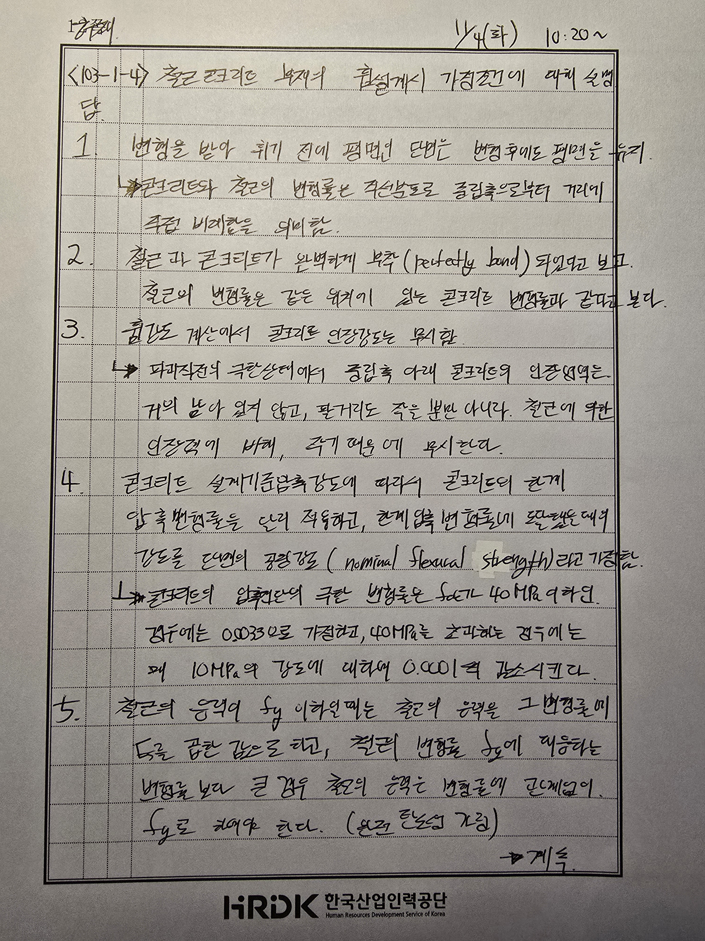 [구조] 철근콘크리트 부재의 휨설계시 가정조건에 대해 설명하시오.