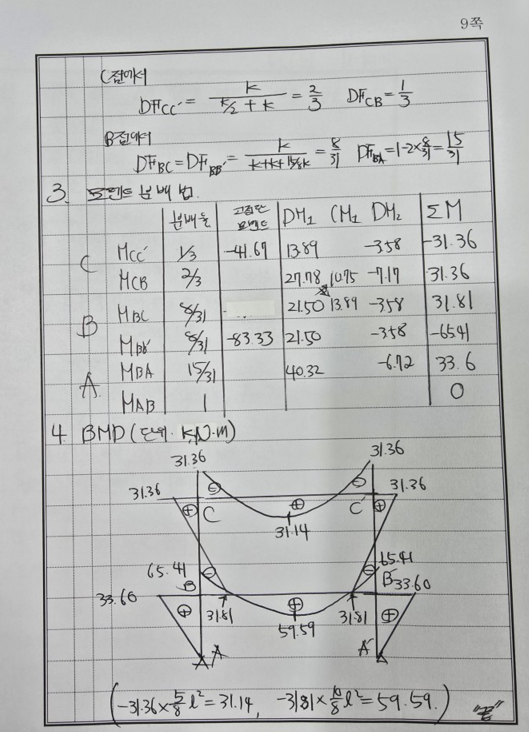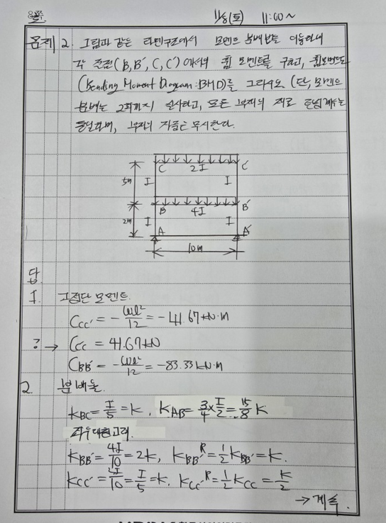 [구조] 라멘구조에서 모멘트 분배법을 이용하여 각 절점에서의 휨 모멘트를 구하고 휨모멘트도를 그리시오.