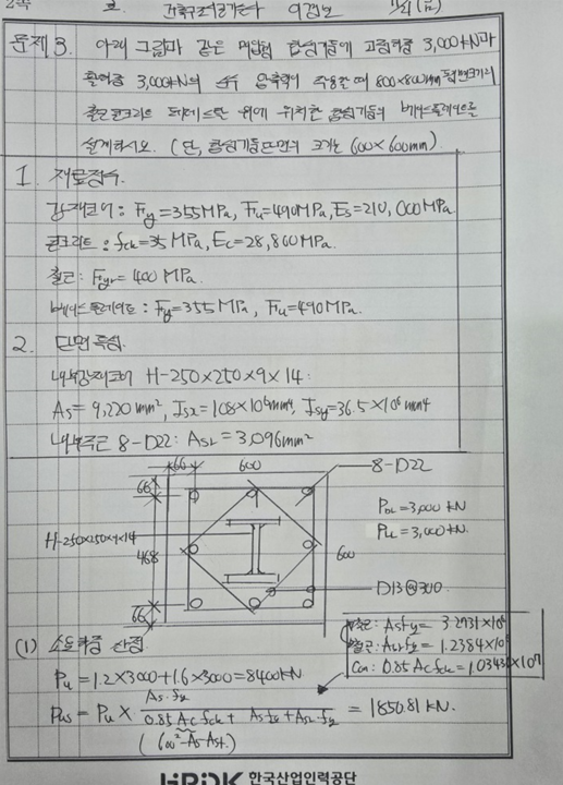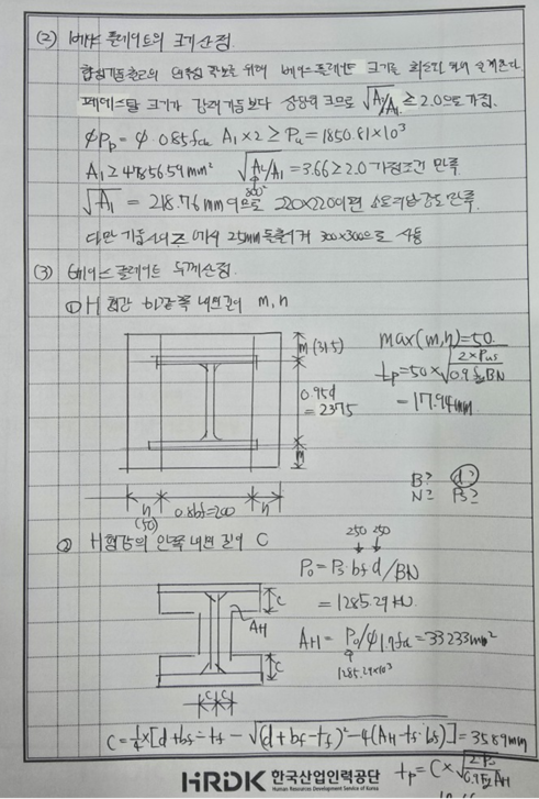[구조] 매입형 합성기둥에 고정하중과 활하중의 순수 압축력이 작용할때 페데스탈 위에 위치한 합성기둥의 베이스플레이트를 설계하시오.