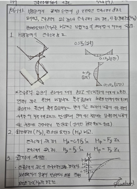 [구조] H형강재의 콤팩트 단면에 일반적인 잔류응력의 분포를 도시화 하고 잔류응력이 없을 경우와 잔류응력이 있을 경우, 휨항복강도, 전소성모멘트를 비교하고 휨거동의 차이점에 대하여 설명하시오.