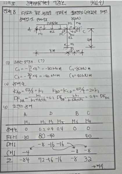 [구조] 부정정 구조물의 휨모멘트도를 모멘트 분배법으로 구하시오.